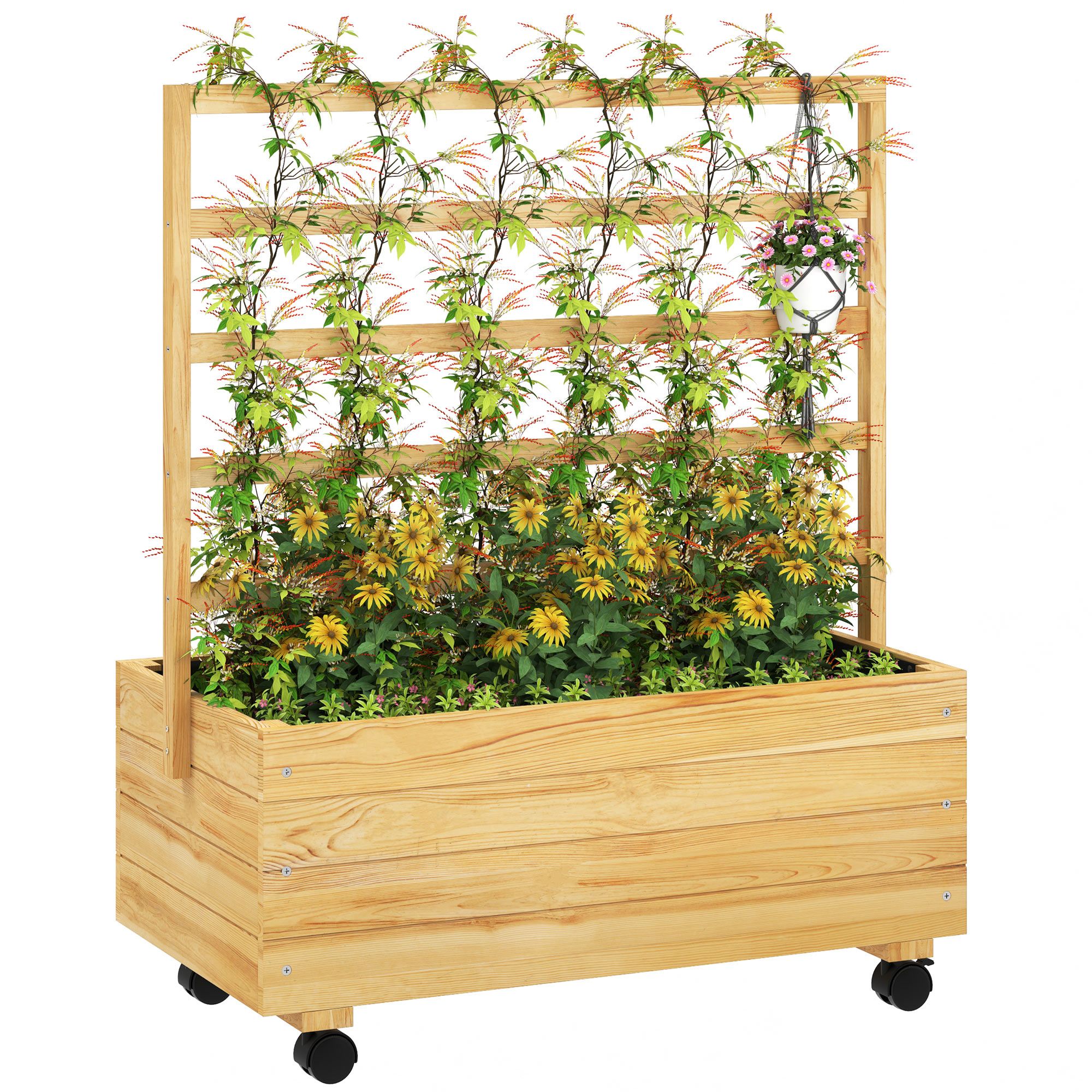 Transform your garden with the Outsunny elevated garden bed, a planter box for vibrant flowers, herbs, and vegetables, and a trellis for climbing plants. Effortlessly move the raised bed around your outdoor space with four universal wheels, two equipped with brakes. Say goodbye to root rot! This flower box made of fir wood has two drainage holes and a non-woven fabric, making it a must-have for any garden enthusiast.